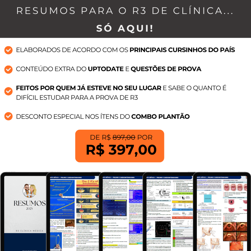Os melhores resumos do mercado, feitos por quem conseguiu a aprovação nas residências mais concorridas do país: UNIFESP, UNICAMP, SANTA CASA (SP) e HOSPITAL SANTA MARCELINA.